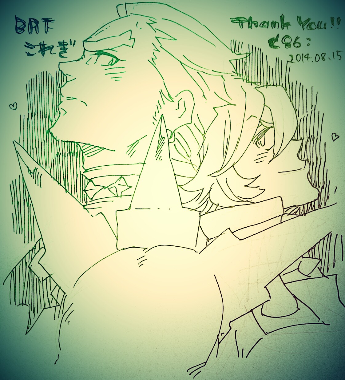 無事にアンソロジーを頒布することができました。 アンソロジーにご寄稿してくださった方々、 当スペースにお越し頂いた方、 本をお手に取って頂いた方皆様、 本当に有難うございました。 前日ほとんど寝ていない状態で、滋養強壮剤を重複してドーピングしておりましたが、 もともとの体力的な面と相まってヘバってしまい周りの方にご迷惑をおかけしてしまいました。 本当に申し訳ないです。 そんな中スペースにお越し頂いた皆様から、 暖かいお言葉を頂き同人をやっていて本当によかったと改めて噛みしめています。 アンソロジーは夏インテでも頒布を予定しております。 わたくし自身は残念ながら参加できないのですが、 インテでもノベルティの配布を行いますので、 参加を考えている方は直接お手に取って頂けたらと思います。 インテが終了致しましたら、書店委託を予定しております。 私個人の本ですが、一度再販をかけた渦苛本は、皆様のお蔭で完売いたしました。 有難うございます。 今回の新刊と、前回のB苛本はアンソロジーと同時期に委託をお願いをする予定ですので、 詳細が決まりましたらPixivとこちらにお報せ致しますので暫しお待ちください。 ・ ・ ・ ・ 私信:M様 先日のコミケでは応援のお言葉と差し入れ有難うございました。 直接お礼を申し上げられなかったのが非常に残念ですが、 M様の暖かいお言葉本当に嬉しかったです。 また機会がありましたら気軽にお声をかけて頂けたらと思います。 本当に有難うございました。 2014.08.14 Thu 21:50:22 祭典明日は夏の祭典に参加致します。